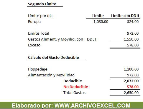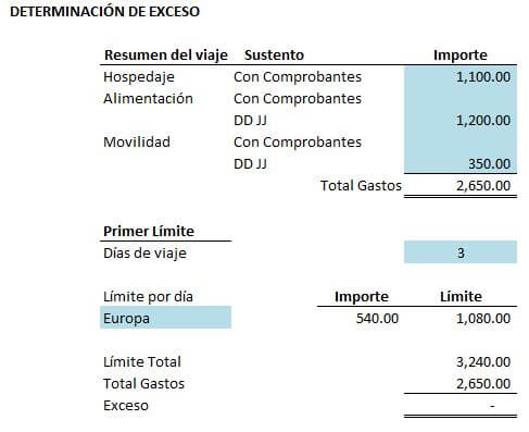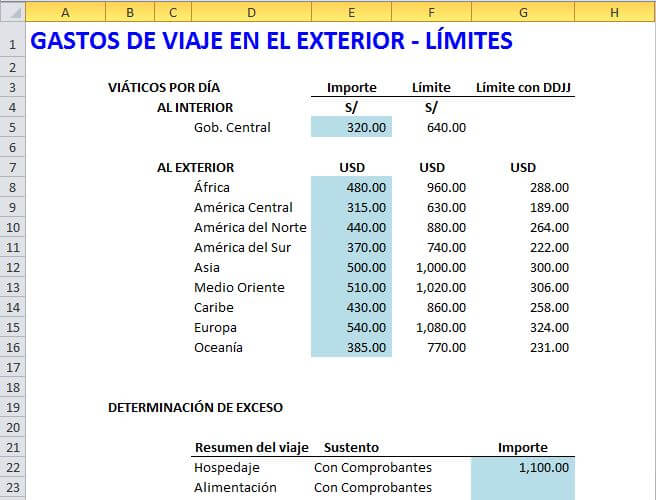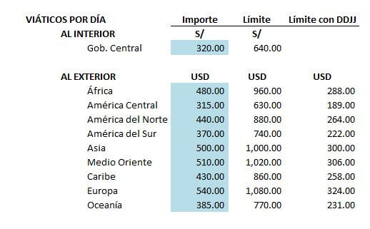 Para sustentar los gastos incurridos en el extranjero se podrán sustentar con los documentos emitidos en el exterior de conformidad con las disposiciones legales del país respectivo, siempre que conste en ellos, por lo menos, el nombre, denominación o razón social y el domicilio del transferente o prestador del servicio, la naturaleza u objeto de la operación, así como la fecha y el monto pagado, conforme a lo dispuesto en el artículo 51°-A de la Ley; o también se podrá sustentar con la “declaración jurada del beneficiario de los viáticos (alimentación y movilidad)” para lo cual dicha declaración deberá contar con la información mínima contenida en el Reglamento13, y la misma no debe exceder del treinta por ciento (30%) del monto máximo establecido en la tabla anterior.